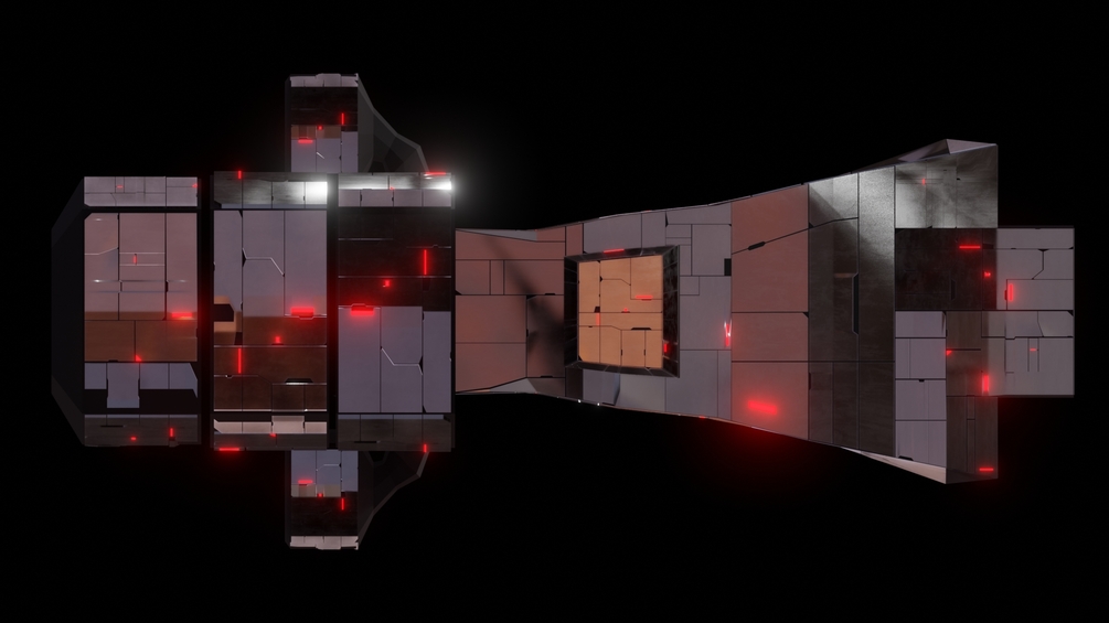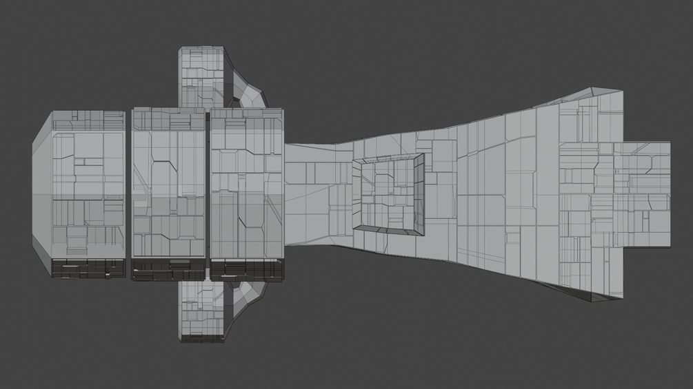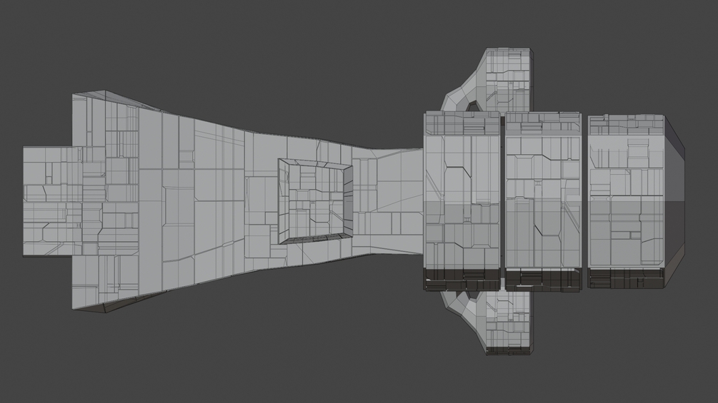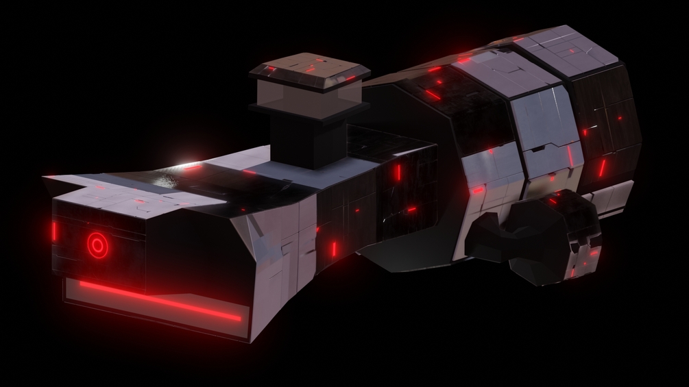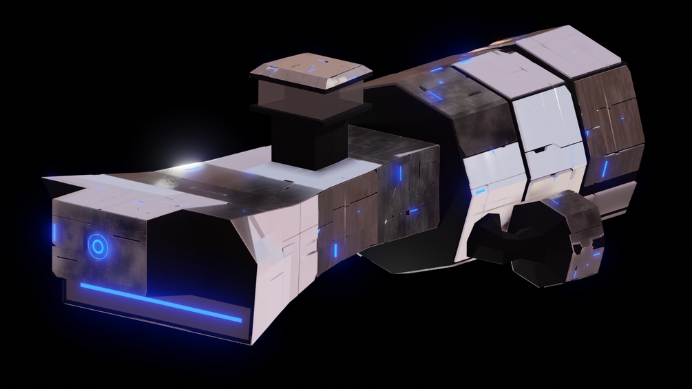 In this Blender scene, you'll get this model as a well-organised hierarchy of objects, a demo HDRI environment and combo of compositing nodes and example materials to make a metallic hull, glowy lights.